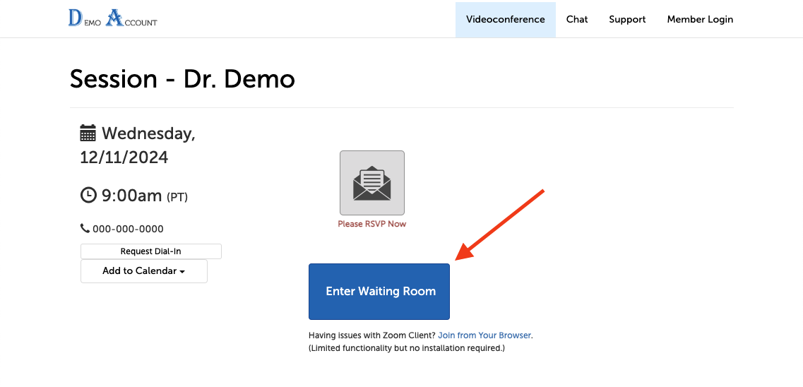 Session participants can enter the waiting room by clicking on a link in their session invitation e-mail. Here is a step-by-step guide to that process. The instructions below assume your session host is using our Zoom integration.