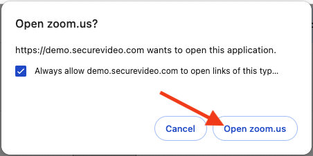 4. If you see a pop up asking if you would like to allow the site to open "zoom.us", please click "Always Allow" and "Open" or "Allow" so the video application can open. The exact message will vary slightly between browsers (Chrome, Safari, Firefox, Edge) but the pop up will look something like this:
